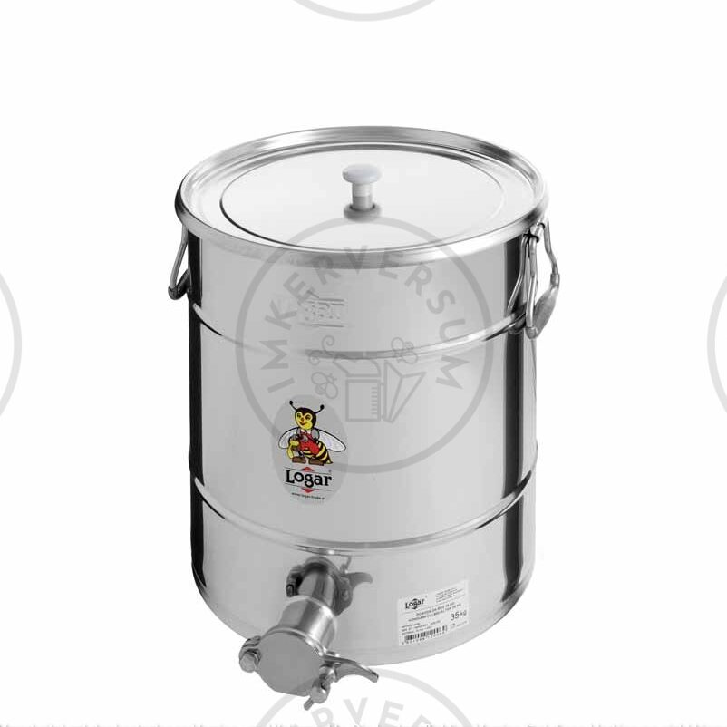 Edelstahl Abfüllbehälter mit Edelstahl-Quetschhahn und Auflagedeckel, 35 kg. Gefäßhöhe 31 cm, Ø 31 cm.