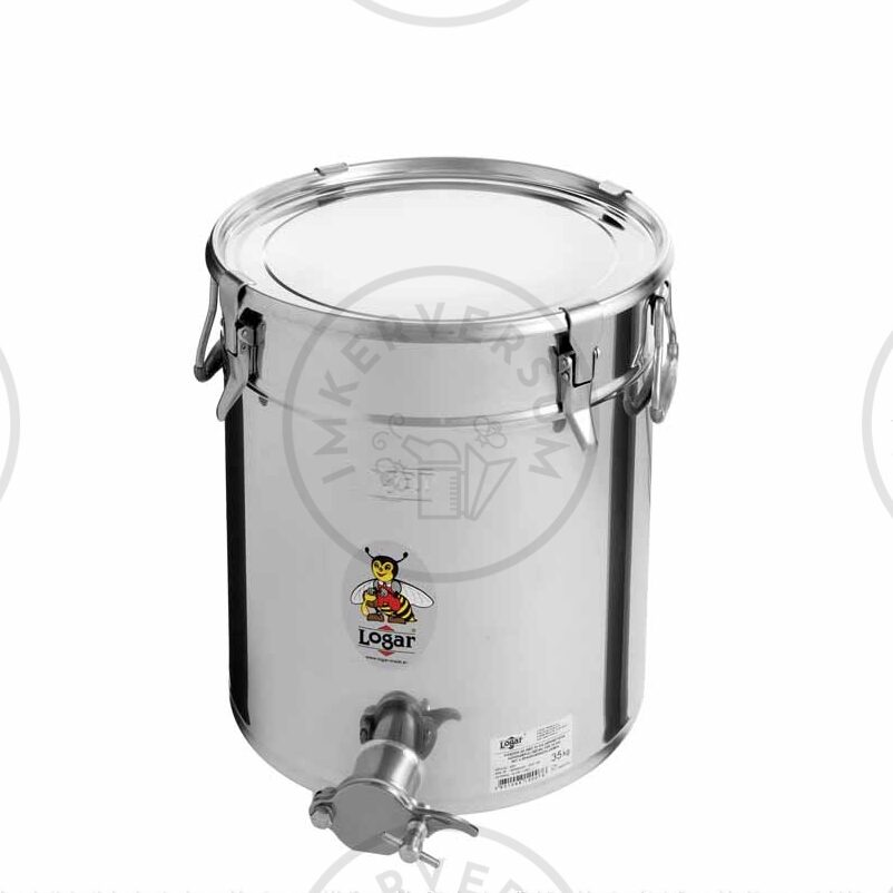 Edelstahl Abfüllbehälter mit Edelstahl-Quetschhahn und Deckel mit Spannverschluss. Durch die Silikondichtung im Deckel kann der Behälter mit den 4 Spannverschlüssen luftdicht verschlossen werden. Gefäßhöhe: 37 cm, Ø 31 cm.
