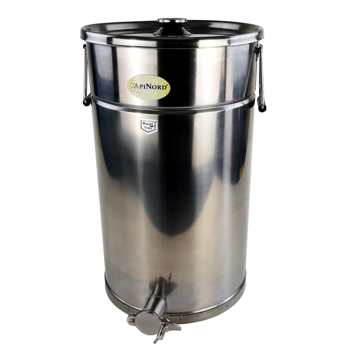 Edelstahl Abfüllbehälter mit Edelstahl-Quetschhahn und Auflagedeckel- 50 kg. Bodengleicher Auslauf. Höhe 52 cm. Ø 30,5 cm. Gewicht ca. 3,5 kg.