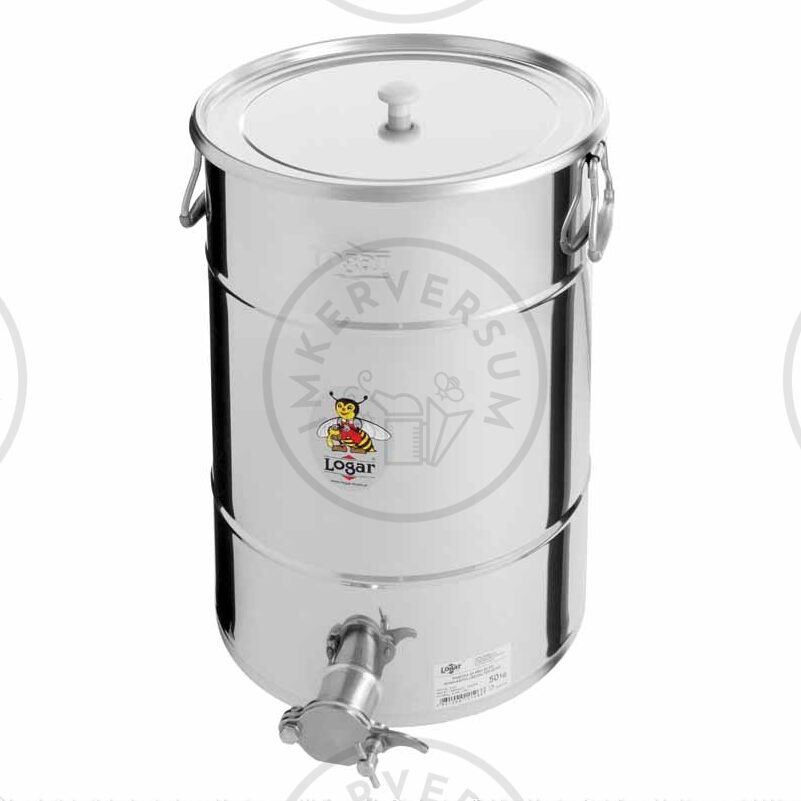 Edelstahl Abfüllbehälter mit Edelstahl-Quetschhahn und Auflagedeckel- 50 kg. Gefäßhöhe: 50 cm, Ø 31 cm.
