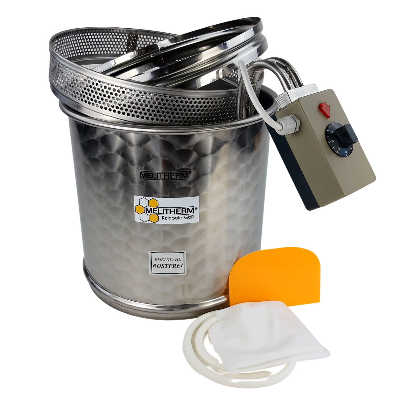 Abfüllbehälter mit Deckel und aufschraubbarem Quetschhahn, Silikondichtung und Spannverschlüssen. Material: Edelstahl. Materialstärke: 0,6 mm. (110 + 180 kg = 0,8 mm.)