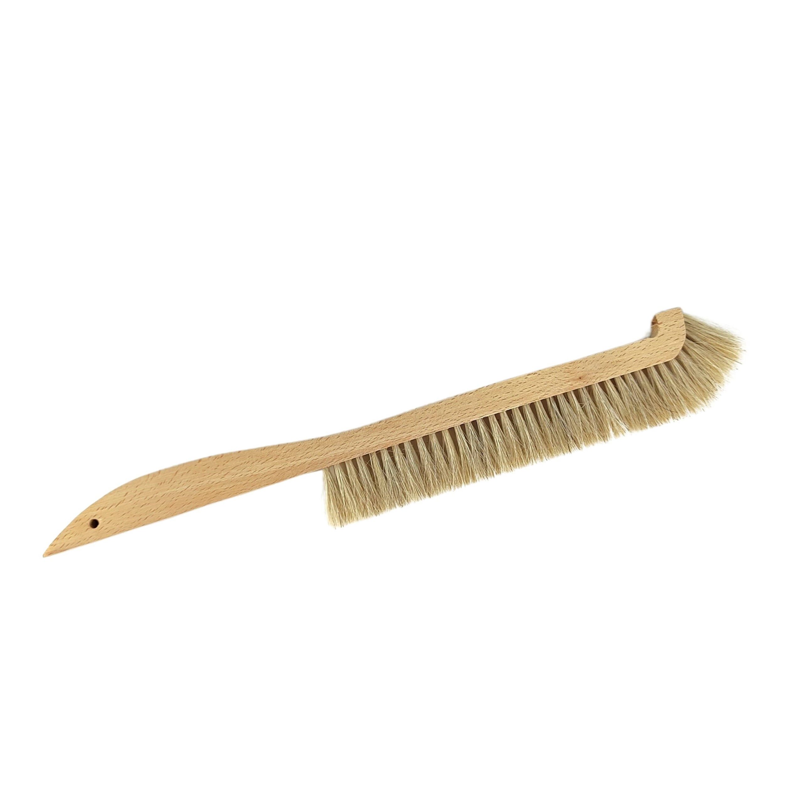 Bienenbesen mit 4 cm. langen Naturhaar- Borsten und stabilem Holzgriff, vorne geschwungen.