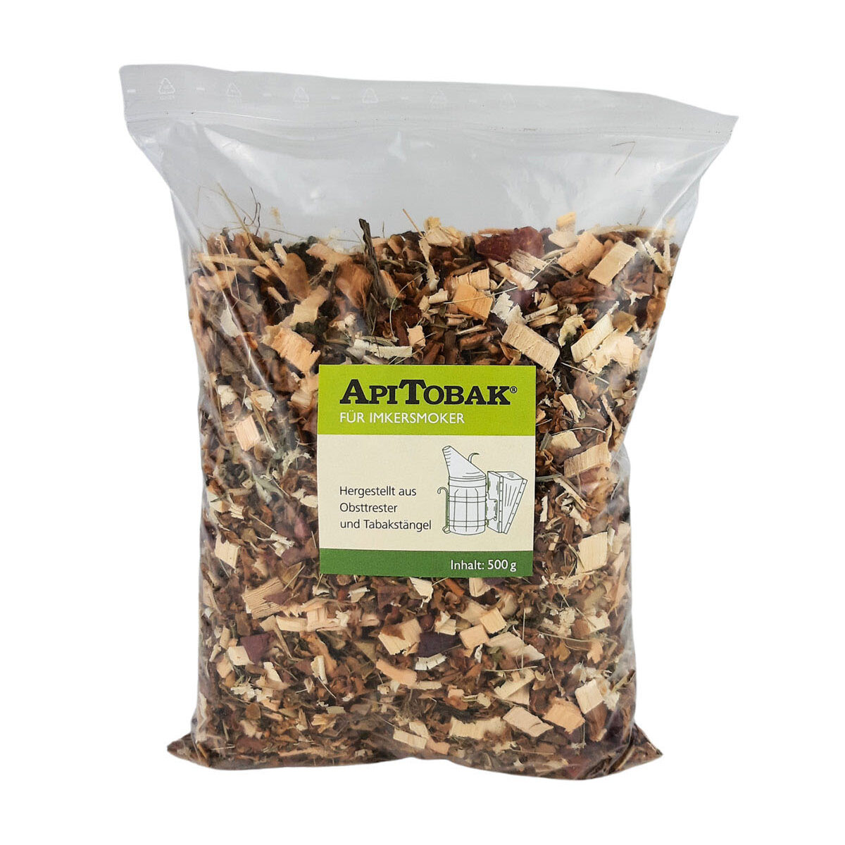 Hochwertiger Rauchstoff für Imker Smoker, hergestellt aus Obsttrester und Tabakstängel. 500 g. Beutel mit Frischeverschluss.