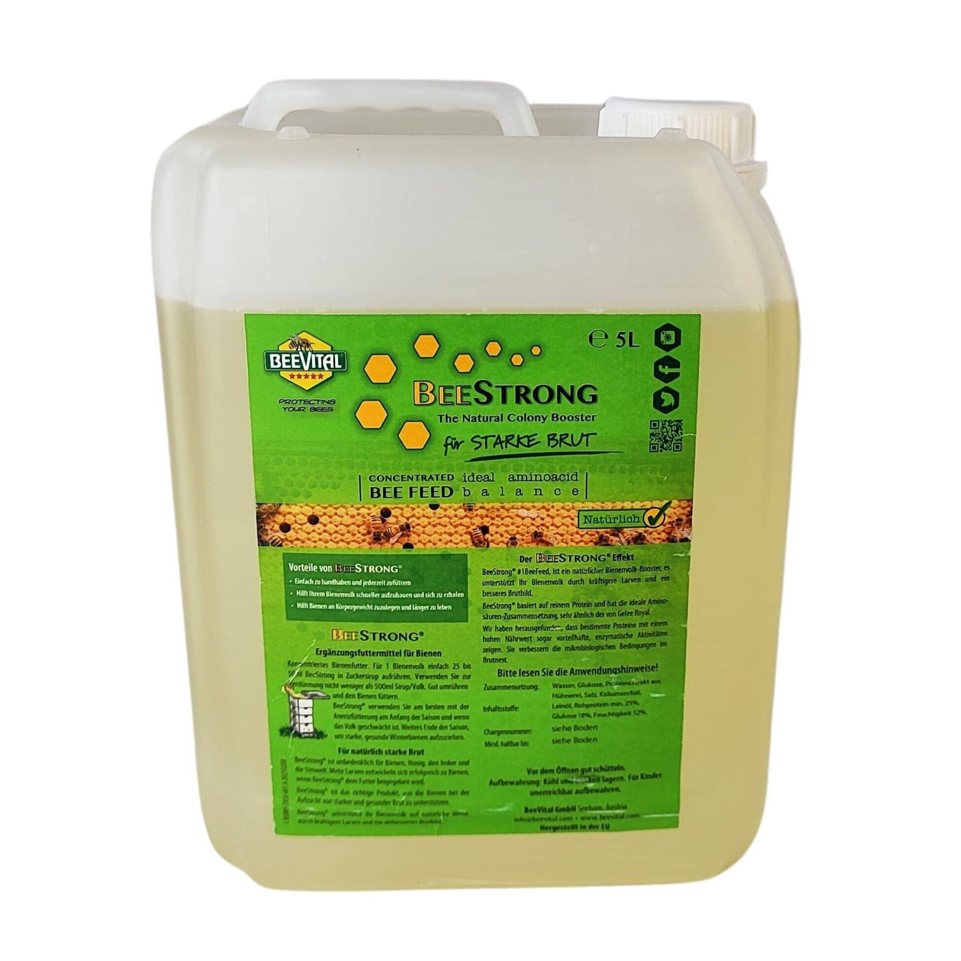 BeeStrong ist ein Bienenfutterkonzentrat aus natürlichen Rohstoffen, welches als qualitativ hochwertiges Kraftfutter eingesetzt wird. Beestrong ist das führende Produkt für die Aufzucht von starken und gesunden Völkern, es unterstützt das Bienenvolk auf natürliche Weise durch Stärkung der Larven und Verbesserung des Brutbildes. Tests haben gezeigt, dass die natürliche antimikrobielle Funktion des Produkts hilft Brutkrankheiten vorzubeugen. Vorteile von BeeStrong: Bienen gewinnen Körpermaße und leben länger. Einfach anzuwenden, keine Saisonalen Einschränkungen, Hilft dem Volk sich zu entwickeln und schneller zu regenerieren, bei niedriger Bienenpopulation. Unbedenklich für Bienen, Honig, den Imker und die Umwelt. Kein Risiko für Honigrückstände. Wann wird BeeStrong angewendet: Im Frühjahr mit der Reizfütterung, damit das Volk mit gesunder Brut stark in die neue Saison startet. Im Spätsommer am Ende der Saison um starke und gesunde Winterbienen aufzuziehen. Während der Saison, wenn Probleme in der Brutentwicklung auftauchen und die Bienen zufütterung annehmen ( In Zeiten von Nektarmangel)Wie wird BeeStrong angewendet: Für 1 Bienenvolk einfach 25 bis 50 ml BeeStrong in Zuckersirup aufrühren. Verwenden Sie zur Verdünnung mindestens 0,5 Liter Sirup pro Bienenvolk, 2 Liter empfohlen. Gut umrühren und den Bienen füttern. Bei Bedarf nach 2 Wochen wiederholen. Empfohlen wird mindestens zweimal pro Jahr zu füttern. Dies ergibt einen Bedarf von ca. 100 ml BeeStrong pro Bienenvolk / Jahr.