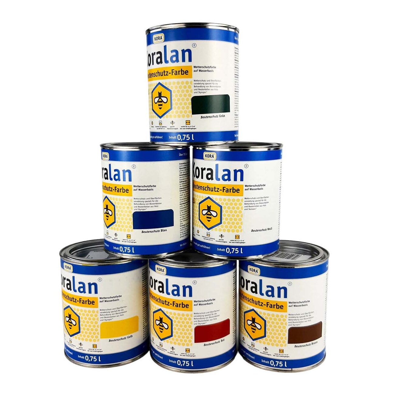 Wetterschutzfarbe auf Wasserbasis, speziell für die Behandlung von Bienenkästen aus Holz und Styropor. 750 ml. Wählbare Farben: Rot, Blau, Grün, Gelb, Weiß oder Braun. Deckender Schutzanstrich und dekorative Oberflächenveredelung für Holz und Styropor (Polystyrol) im Außenbereich. Schützt Bienenkästen und Beutenteile vor Witterungseinflüssen wie Regen und Sonne. Aufbringmenge: ca. 160 ml / m² in zwei Arbeitsgängen. Eigenschaften: Geprüfte Bienenverträglichkeit. Erfüllt die Anforderungen nach DIN EN 71-3 „Sicherheit von Spielzeug“ gem. RL 2009/48/EG Verläuft gut, problemlose Verarbeitung, Milder Geruch, nach Trocknung geruchlos, Feuchtigkeitsregulierend, nach Trocknung wasserabweisend, Deckend, elastisch, seidenglänzend, UV Schutz.