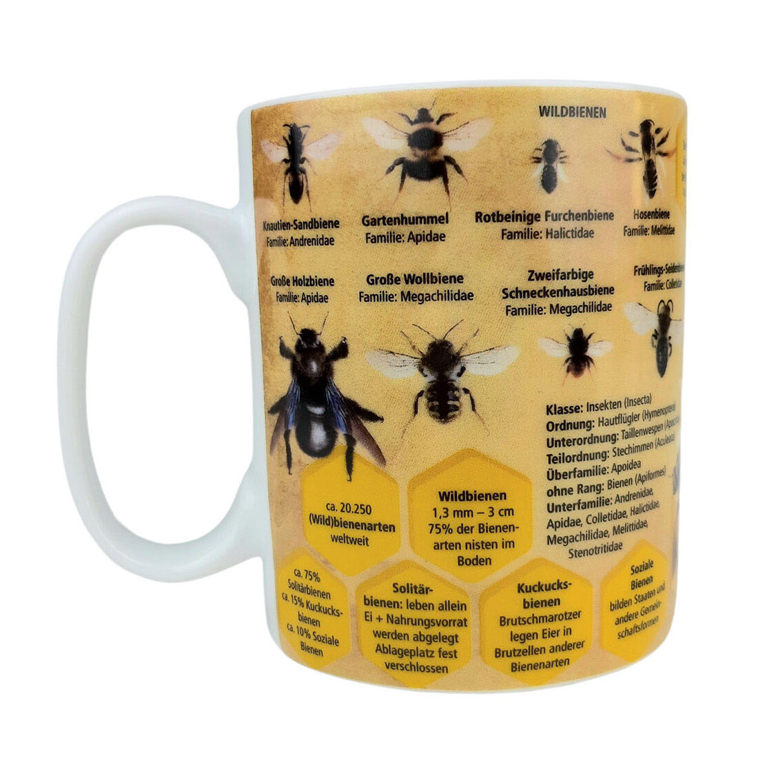 Keramik Tasse mit Skizzen und interessanten Fakten über Honig- und Wildbienen. Spülmaschinen- und Mikrowellenfest. Höhe: ca. 11 cm, ø ca. 9 cm.