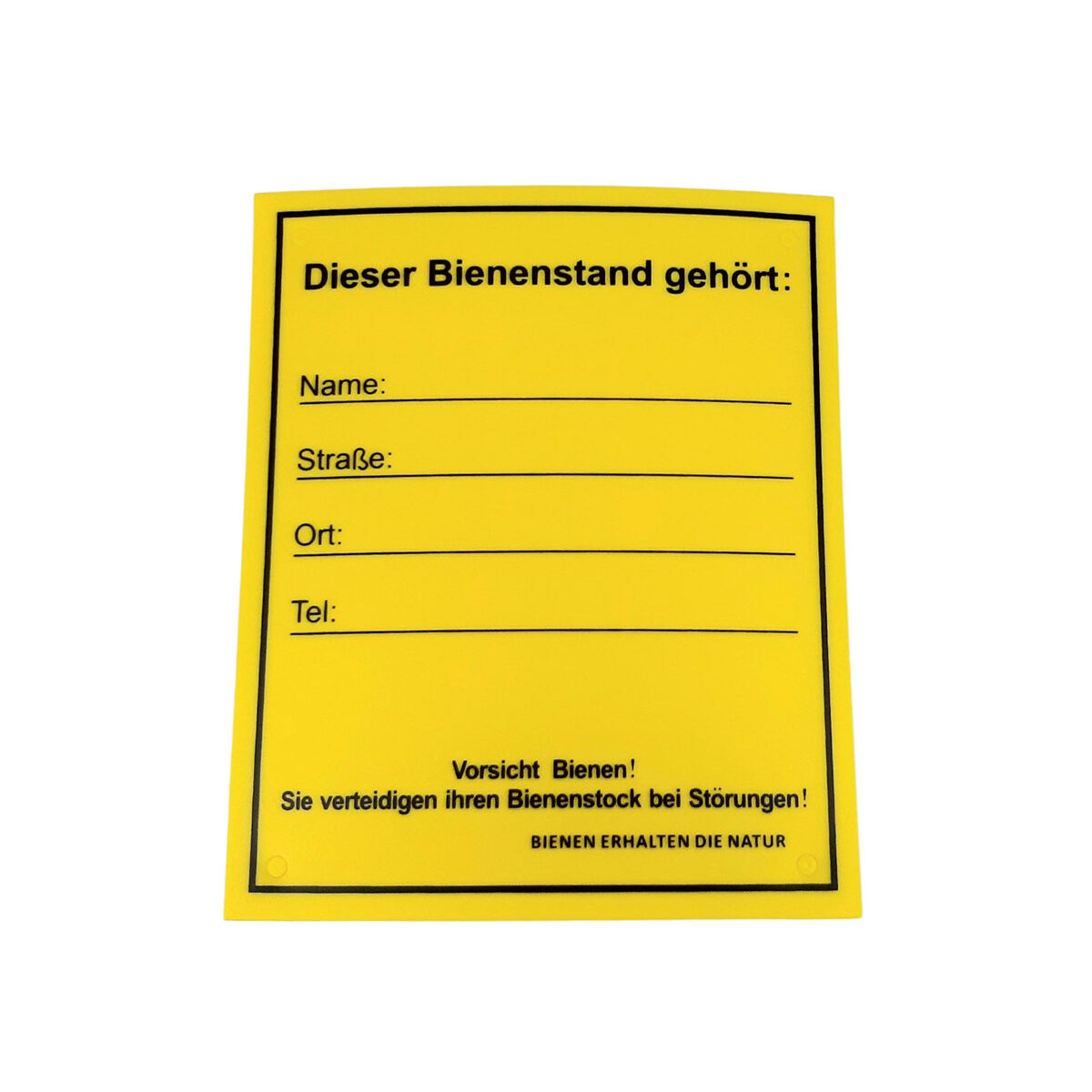 Bienenstandschild und Warnschild in einem. 1 mm PVC mit lichtfestem schwarzen Druck. Größe ca.: 12,5 x 15 cm.