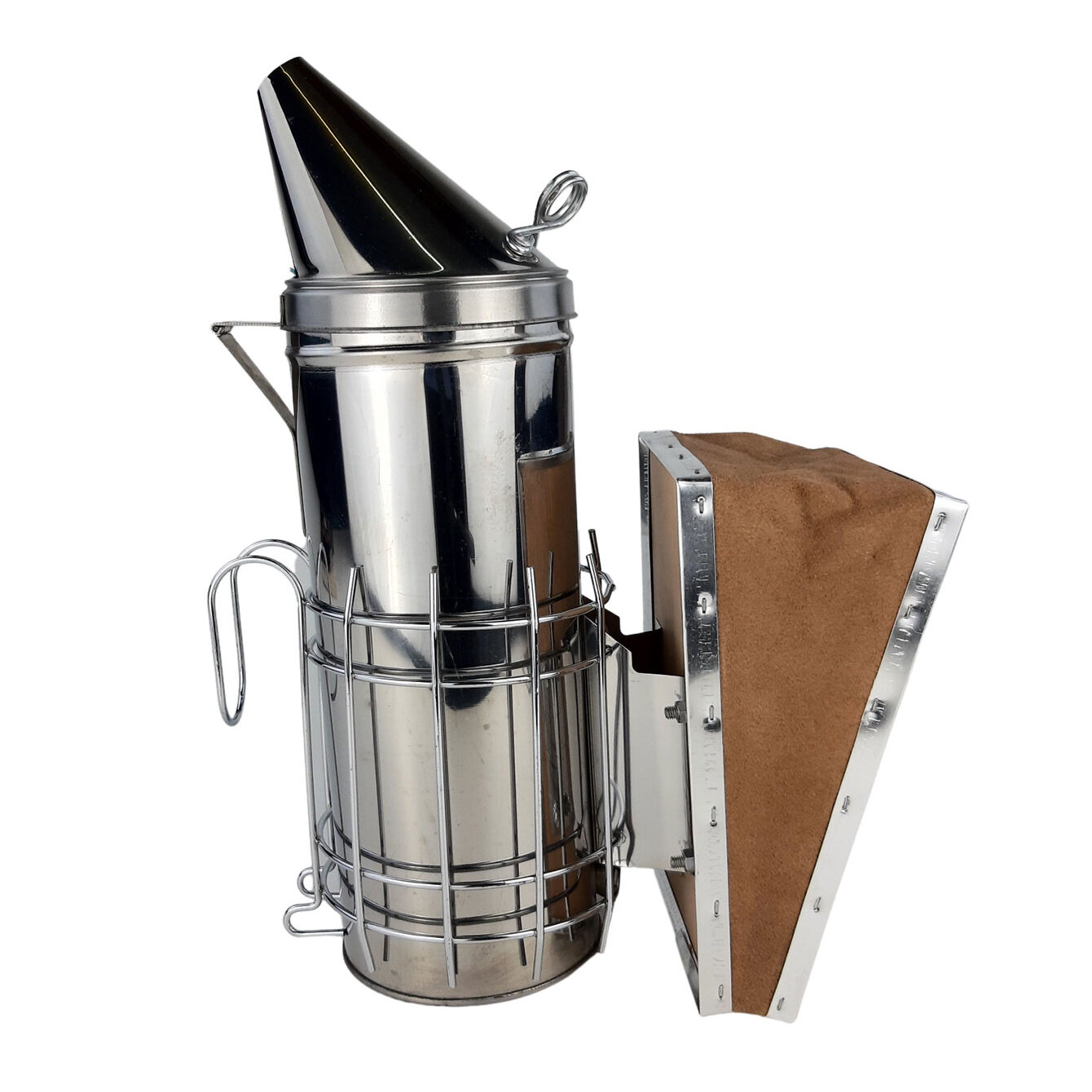 Edelstahlkessel 10 cm, Innen- Rauchgitter, Außenschutzgitter mit Anhängehaken und Lederblasebalg. Höhe: ca. 34,0 cm, Gewicht: 1,0 kg.