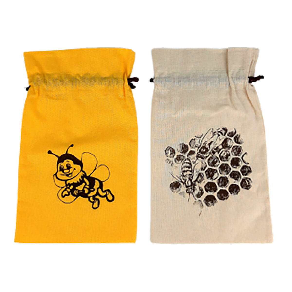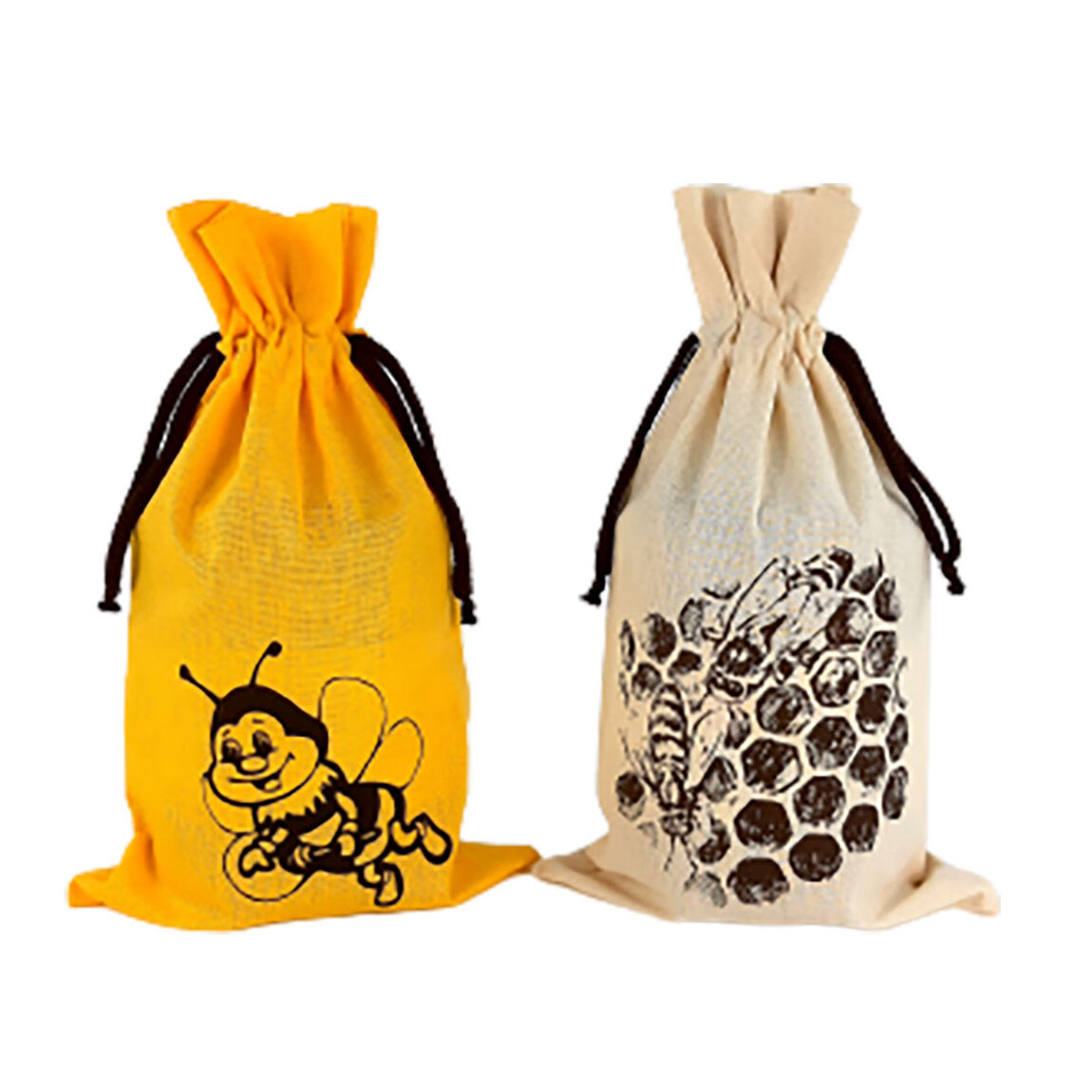 Beutel aus gefärbter Baumwolle mit Aufdruck und Kordel Zugverschluss. Gelb oder Beige. Passend für z. B. 1 kg Glas oder 2 Stk. 0,5 kg Gläser übereinander. Abmessungen: ca. 29 x 16 cm: Auf der Abbildung befindet sich ein 1 kg. Honigglas im Beutel. Lieferung ohne Glas.