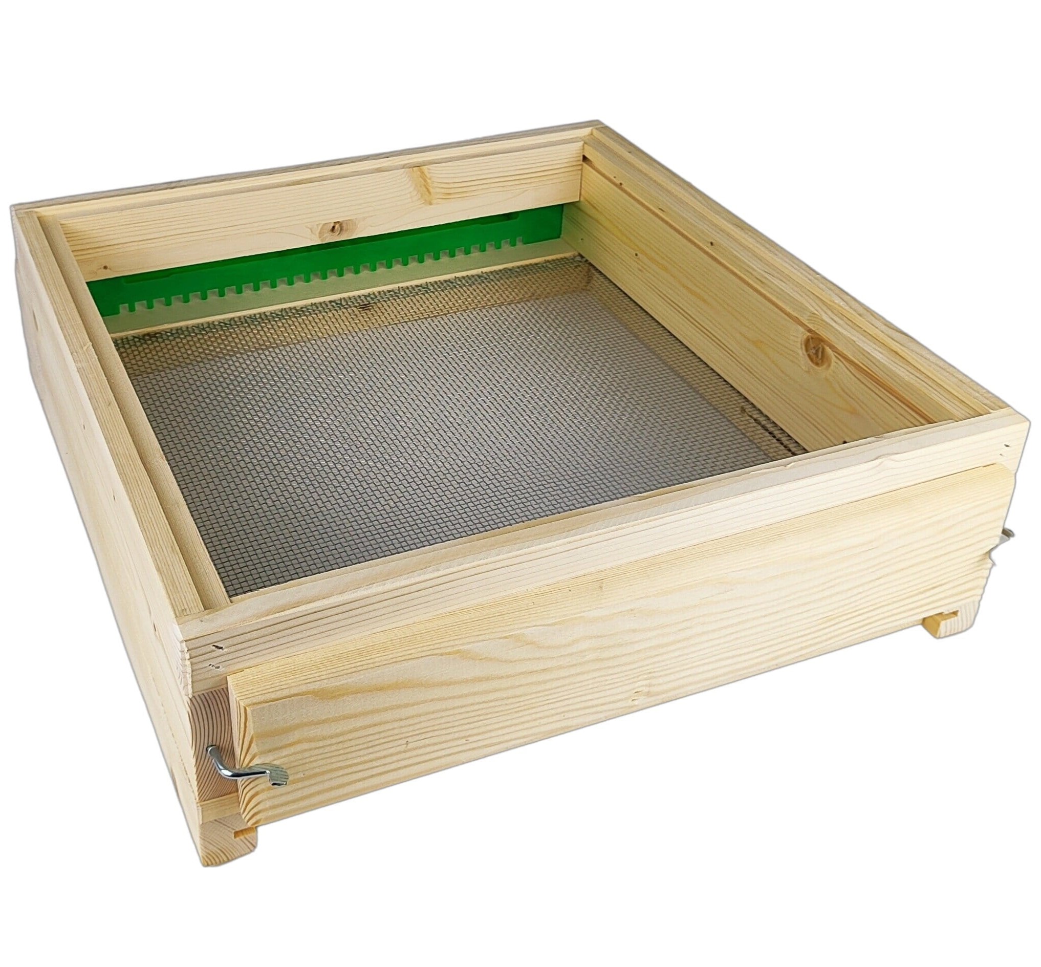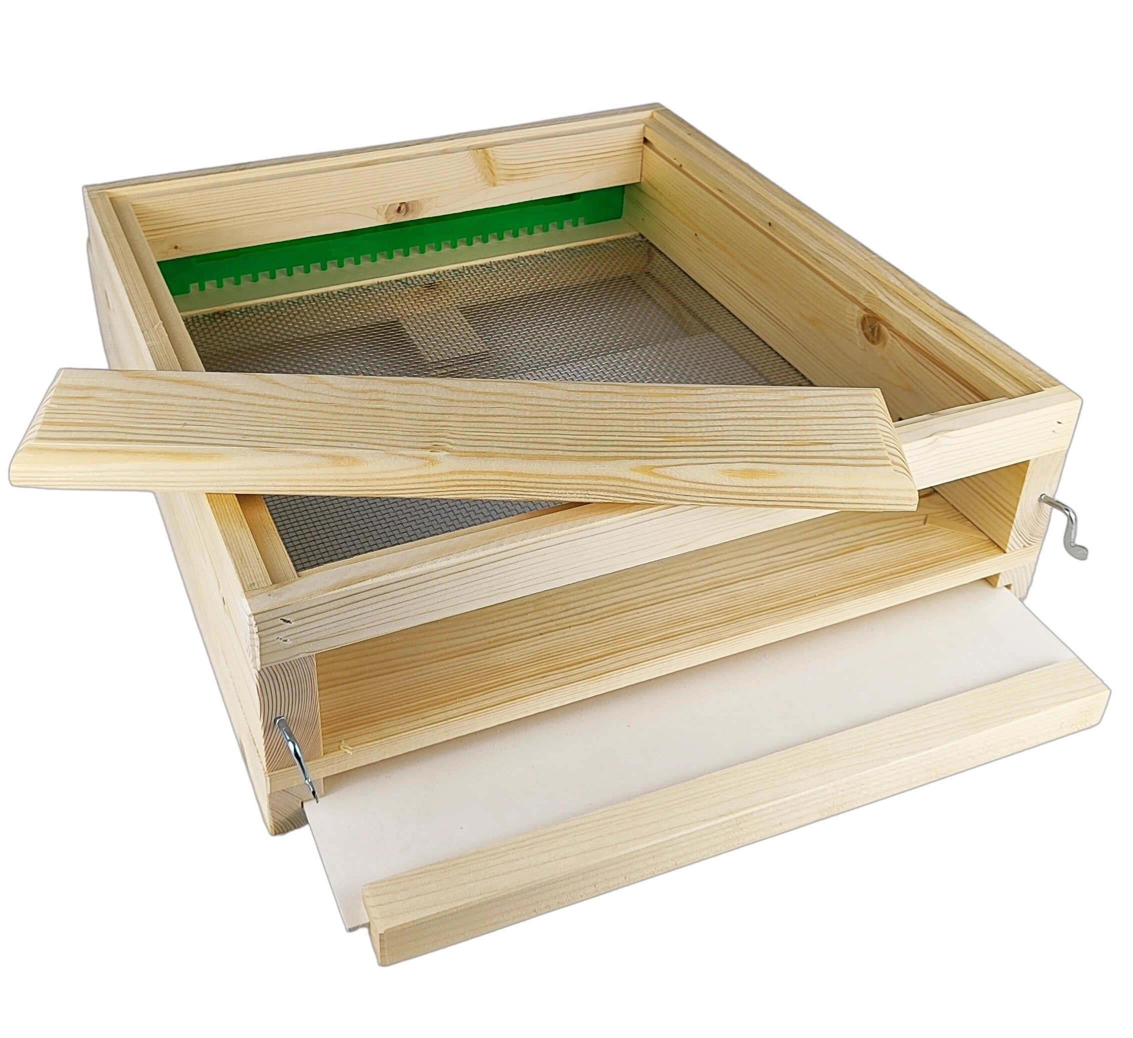 Boden Hoch mit Edelstahlgitter, Kunststofflade mit Holzgriff, Putzkeil der mit 2 Metallreiber verschlossen wird sowie ein Fluglochstecker (Kunststoff in versch. Farben) der mit einem Metallreiber befestigt wird. Auf den seitlichen Innenseiten befinden sich je 1 Nut um eine Bausperre (nicht inkl.) montieren zu können. Vorne unter dem Flugloch befinden sich ebenso 2 Führungsschlitze um ein Anflugbrett (nicht inkl.) aufstecken zu können. Hersteller: Bienen Janisch.