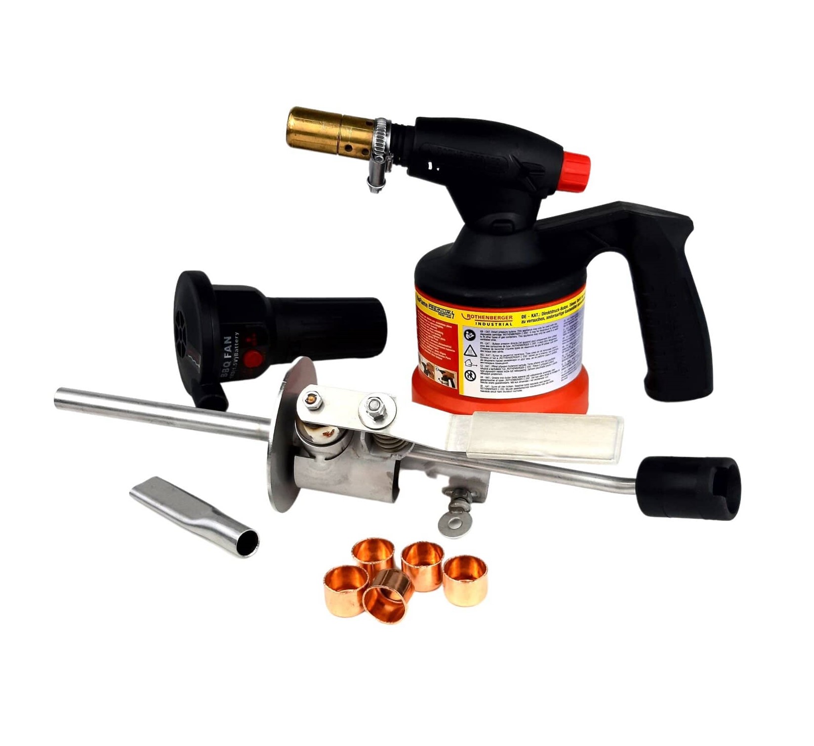 GTM-Verdampfer mit Gebläse. Der GTM Verdampfer mit dem gebrauchsmustergeschützten Kugeldruckfederverschluss und Gaskartuschenbetrieb ist bestens für die Anwendung von Oxalsäure in Tabletten- oder Pulverform geeignet. Lieferumfang: Verdampfer aus Edelstahl mit Kugelverschluss, Lötlampe mit piezoelektrischer Zündung (ohne Gaskartusche!) Ventilator/ Gebläse (ohne Batterie) 5 Stück Kupferhütchen und eine Anleitung. Funktion und Anwendung: Der GTM Oxalsäureverdampfer aus Edelstahl wird mit dem Brenneraufnahmerohr auf die Lötlampe mit piezoelektrischer Zündung aufgesteckt und die Fixierschraube händisch fest angezogen. 1,5 V Monozelle (Größe: D) in den Ventilator einsetzen und in den schwarzen Gummiadapter des Verdampfers stecken. Brenner zünden und Ventilator einschalten. GTM Verdampfer über das Flugloch oder durch eine Bohrung in der Hinterseite des Bodens anbringen. Kugelverschluss öffnen und die Verdampfungskammer wird mit einem Kupferhütchen (ø 18mm) bestückt, das im abgekühlten Zustand mit 1 oder 2 Gramm Oxalsäure- Pulver oder Tabletten befüllt wird (Menge je nach Volkstärke oder Beutengröße). Kugelverschluss schließen (mit metallischem Klingen einrasten lassen). Nach 2,5 Minuten Verdampfer aus dem Boden/ Magazin nehmen. Verschluss öffnen und das Gerät über einen bereitgestellten Wassereimer kippen bis das heiße Kupferhütchen hineinfällt. Die Beute weitere 10 Minuten mit einem Schaumstoffstreifen oder nassem Tuch verschlossen halten. Währenddessen kann das nächste Bienenvolk behandelt werden. Achtung: Während der Anwendung ist eine Schutzmaske, Handschuhe und eine Schutzbrille zu tragen.