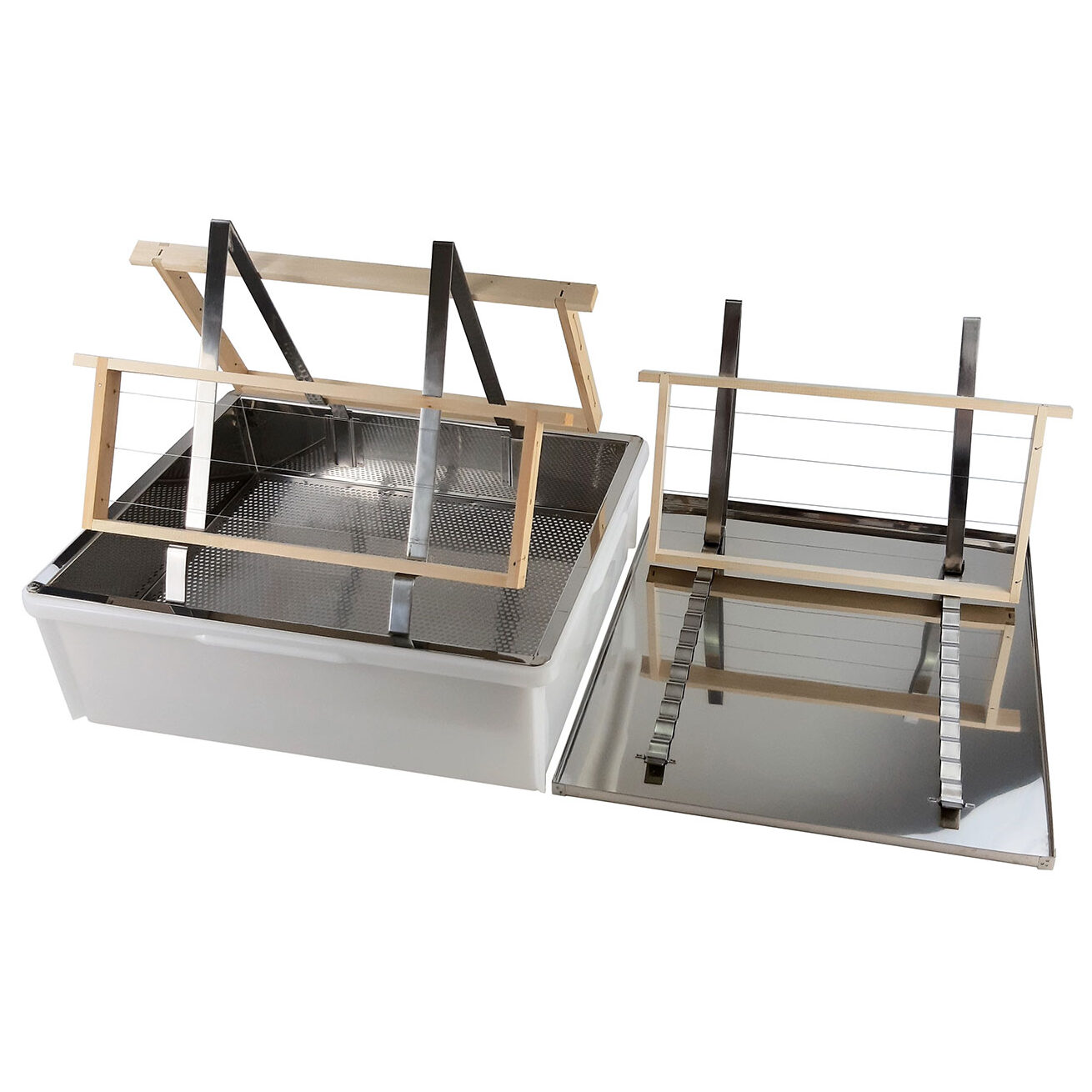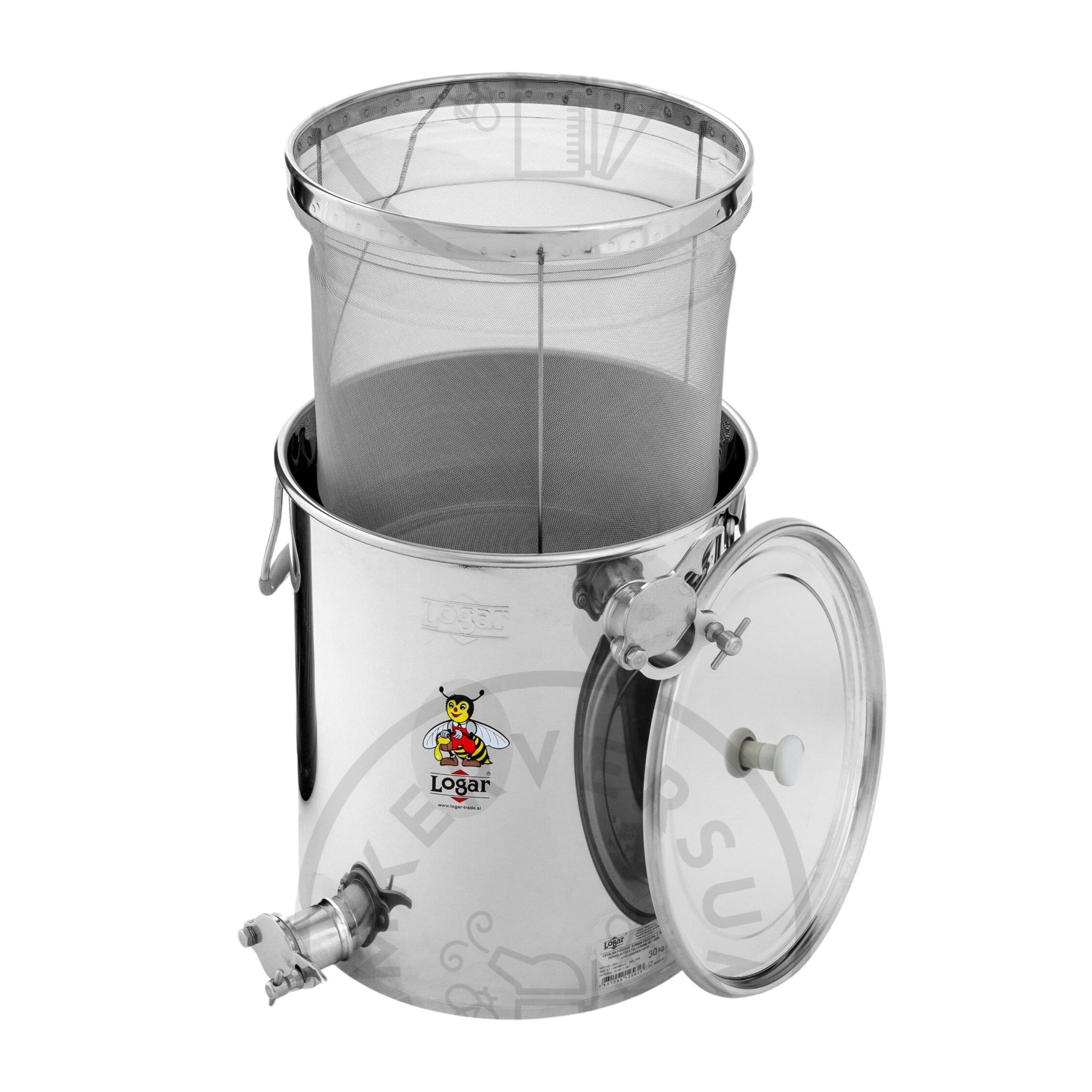 Die Unterstell- Siebkanne mit zwei Quetschhähnen eignet sich perfekt zum Sieben beim Honigschleudern. Diese wird unter den Quetschhahn der Honigschleuder gestellt. Der untere Quetschhahn der Siebkanne wird geschlossen. Der Honig hebt sich bis zum oberen Quetschhahn und fließt durch diesen in einen Unterstellkübel ab. Mittels dem Feinsieb wird der Honig in der gefüllten Siebkanne kontinuierlich gesiebt. Durch den Zufluss des Honigs heben sich die Wachsreste auf die Oberfläche und können einfach abgeschöpft werden. Das Feinsieb verstopft auch bei ganztägigem Einsatz nicht. Am Ende des Honigschleuderns kann die Siebkanne über den unteren Quetschhahn entleert werden.