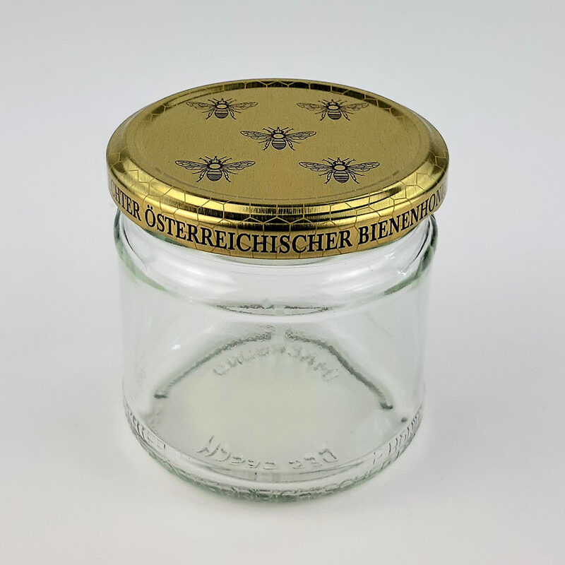 Honigglas Österr. Imkerbund, 250 g/ 212 ml. Safepack zu 20 Stk. inkl. Deckel, TO70 Gold- 5 Bienen (Nr. 573 – nicht aufgeschraubt!). Dieser Artikel wird nur mit Palette versendet (aufgrund des Glasbruches)! Paletten Versand erfolgt über die Berechnung des Online Shops ab 39,1 kg.