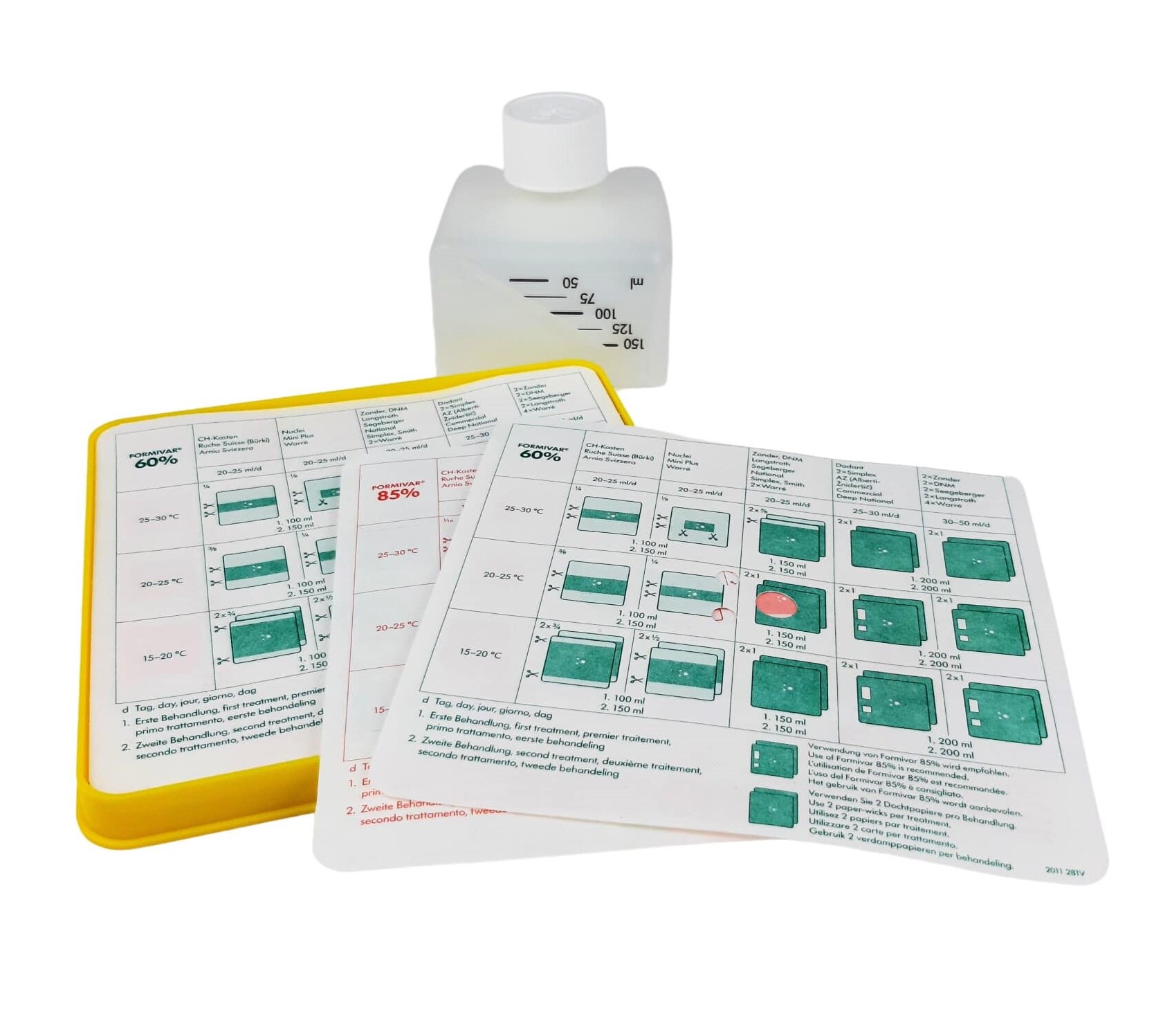 Liebig Dispenser; mit Kunststoff-Tropfflasche- 200 ml; und vier Dochten zum Verdunsten von Ameisensäure. Der Liebig Dispenser wird mit einer Flasche sowie kindersicherem Verschluss, Tropfeinsatz, vier perforierten Dochtpapiere und der Grundplatte geliefert. Anwendung: Die Größe des Dochtpapiers einfach dank der Perforierung je nach Ameisensäure (60 % oder 85 %), Tagestemperatur und Beutesystem anpassen und auf die Grundplatte legen. Tropfeinsatz entfernen und Flasche mit Ameisensäure bis zur empfohlenen Markierung füllen. Anschließend den Tropfeinsatz wieder aufstecken (Die Flasche sollte im Voraus an einem geeigneten Ort gefüllt werden). Die mit Ameisensäure gefüllte Flasche wird auf die Grundplatte über das Dochtpapier gesteckt, und anschließend in das Bienenvolk auf die oberen Rähmchen des Brutraumes gestellt (bei abgenommenen Honigräumen). Die Ameisensäure läuft langsam aus und wird vom Dochtpapier vollständig aufgesogen und verdampft langsam und gleichmäßig in die Stockluft ab. Hinweis: Der Umgang mit Ameisensäure erfordert große Vorsicht. In jedem Fall Schutzbrille, säurefeste Handschuhe und langärmlige Bekleidung tragen!!!