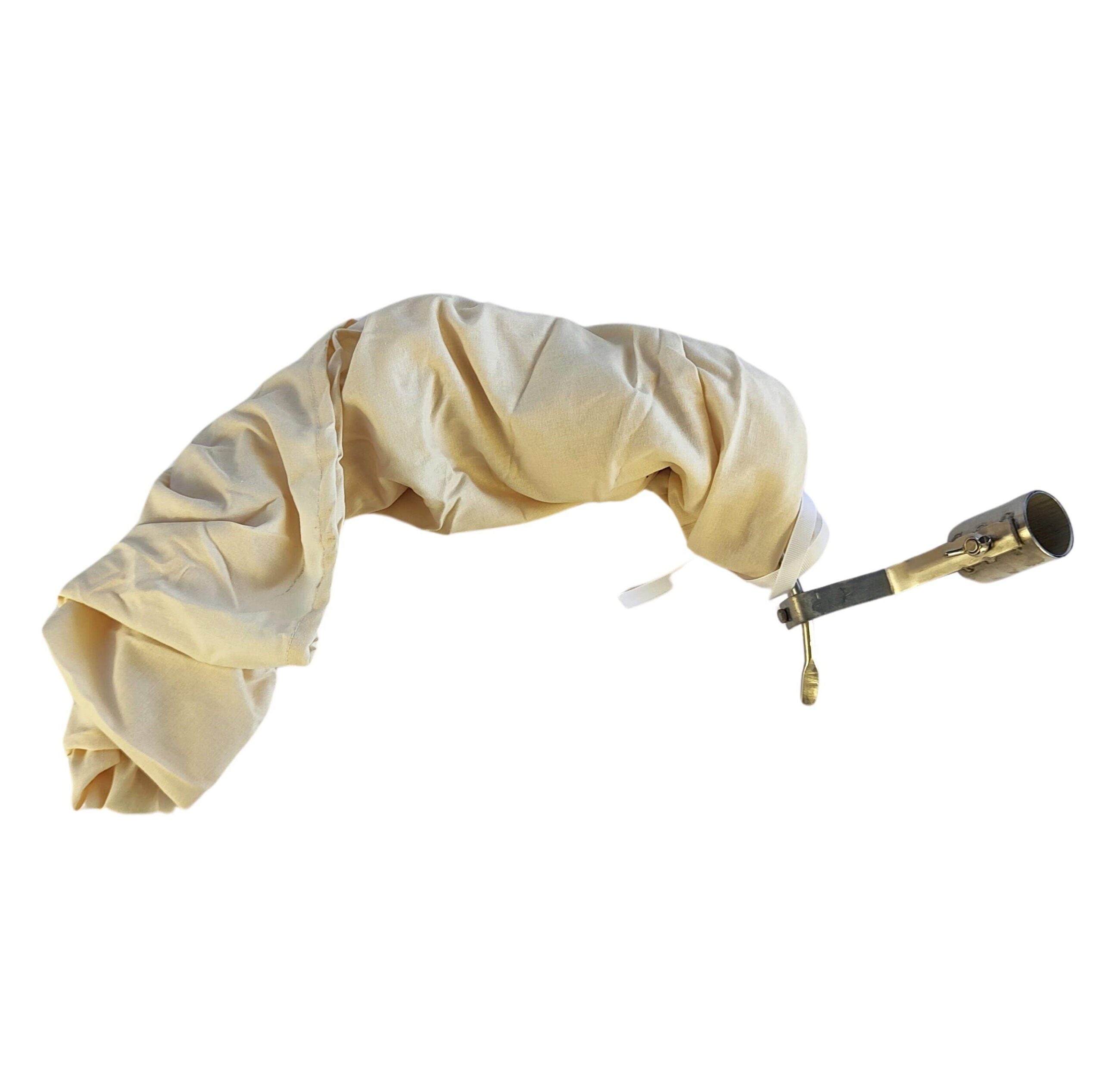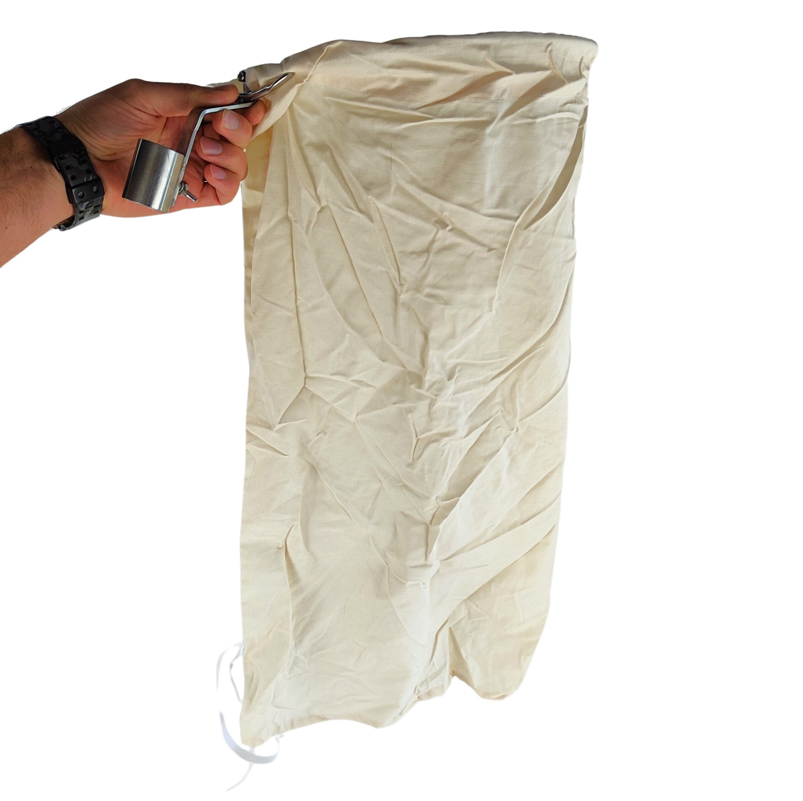 Der Beutel ist unten offen, lässt sich aber mit den angenähten Bänder verschließen. So kann der Schwarm eingefangen werden, und durch öffnen der Bänder über einer Zarge/ Kiste, kann der Schwarm einfach „eingeschlagen“ werden.