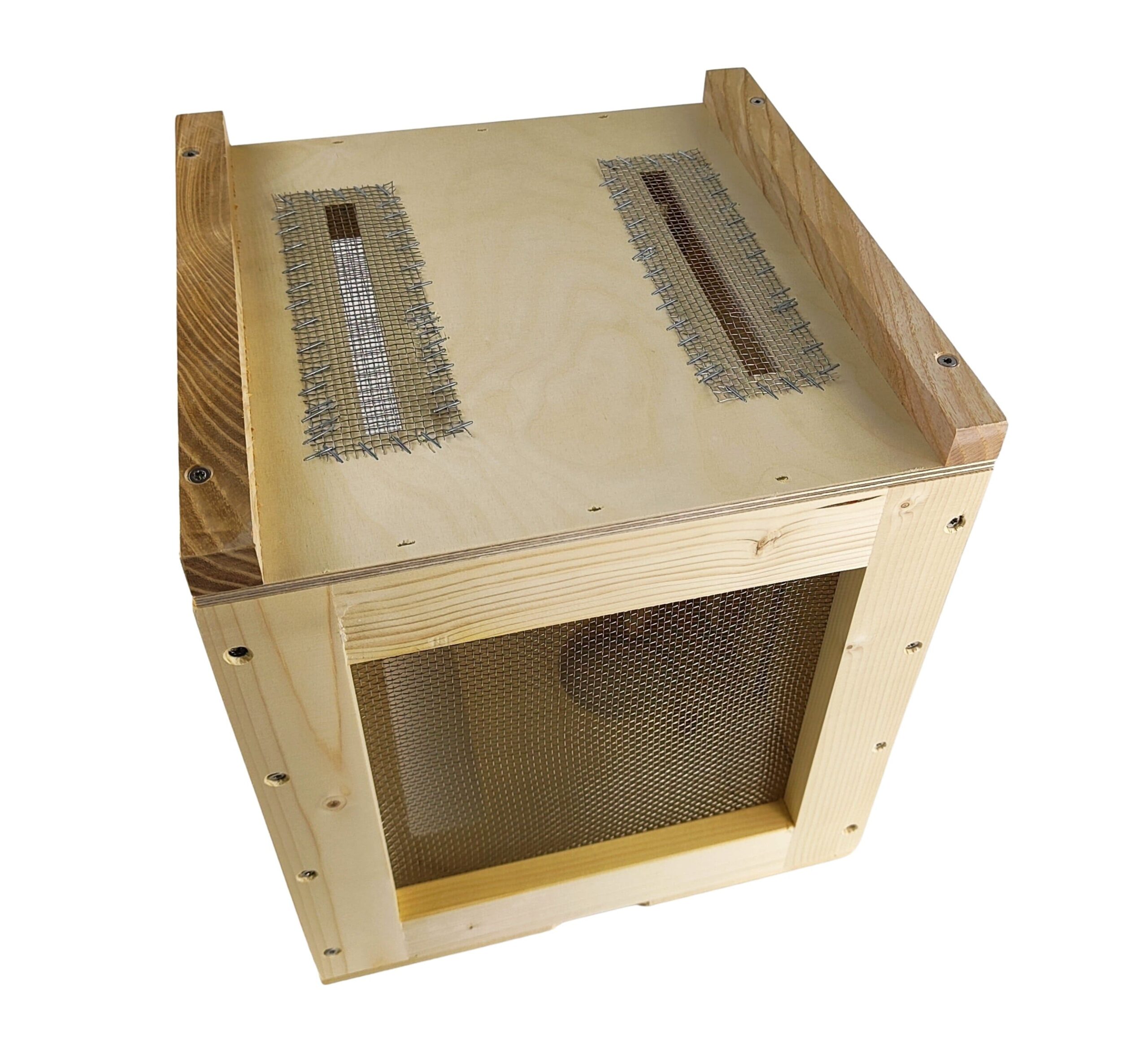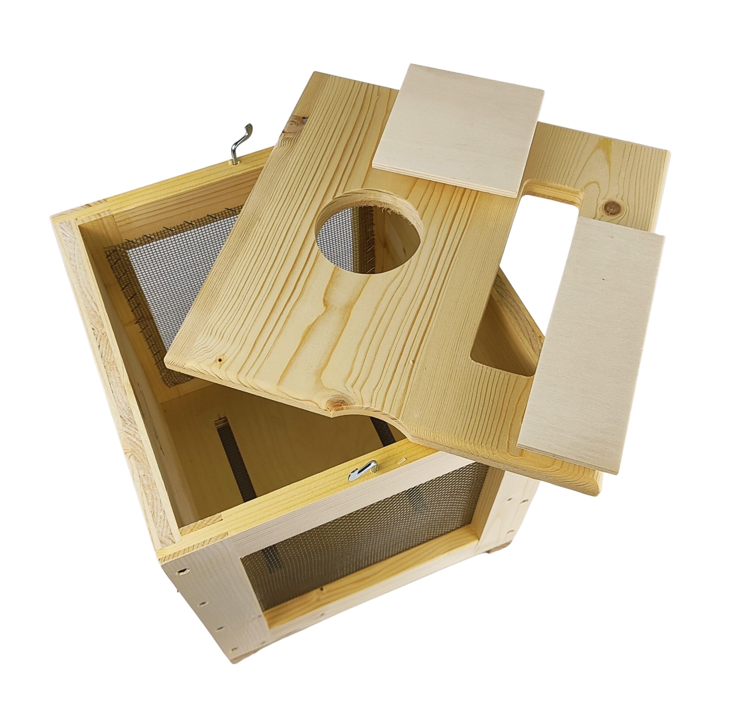 Massive Ausführung für ca. 4 kg Bienen bei einem Fassungsvermögen von 24 Liter. Eckverbindung: überfälzt, verleimt und verschraubt. Das Gitter auf 2 Seiten ist aus Edelstahl. Der Deckel hat 2 Öffnungen, für runde oder eckige Trichter und wird mit 2 Metallreiber verschlossen.