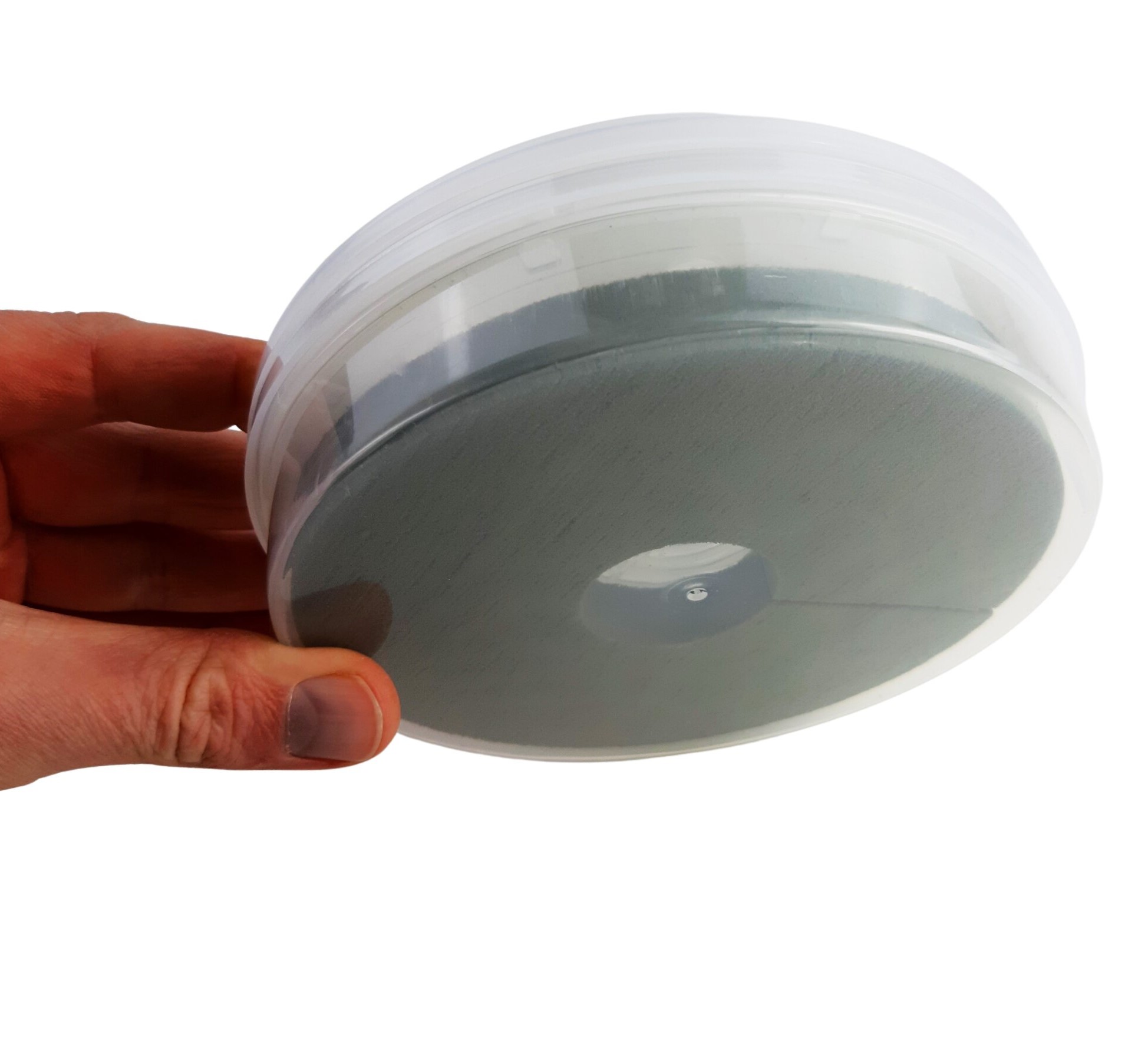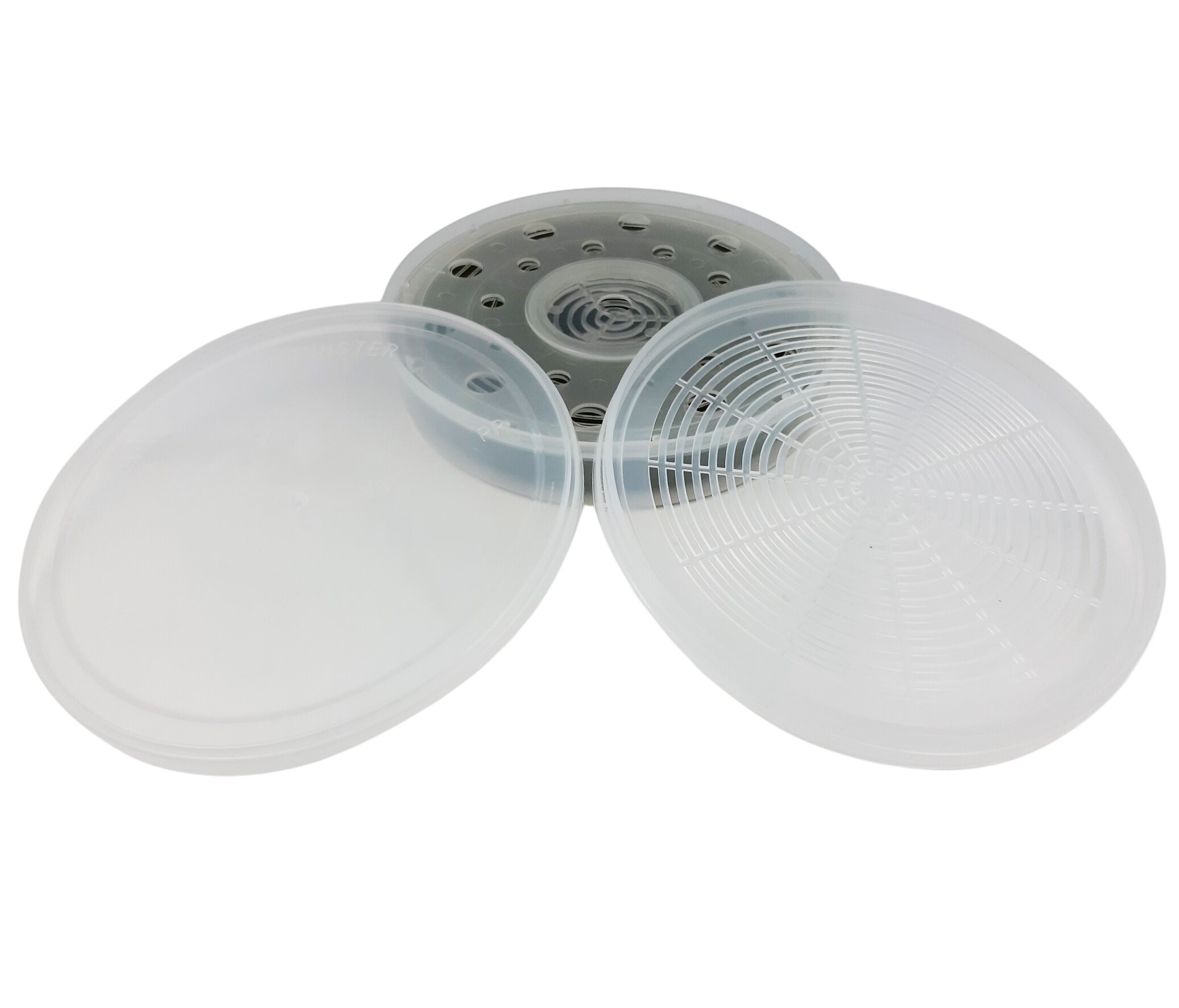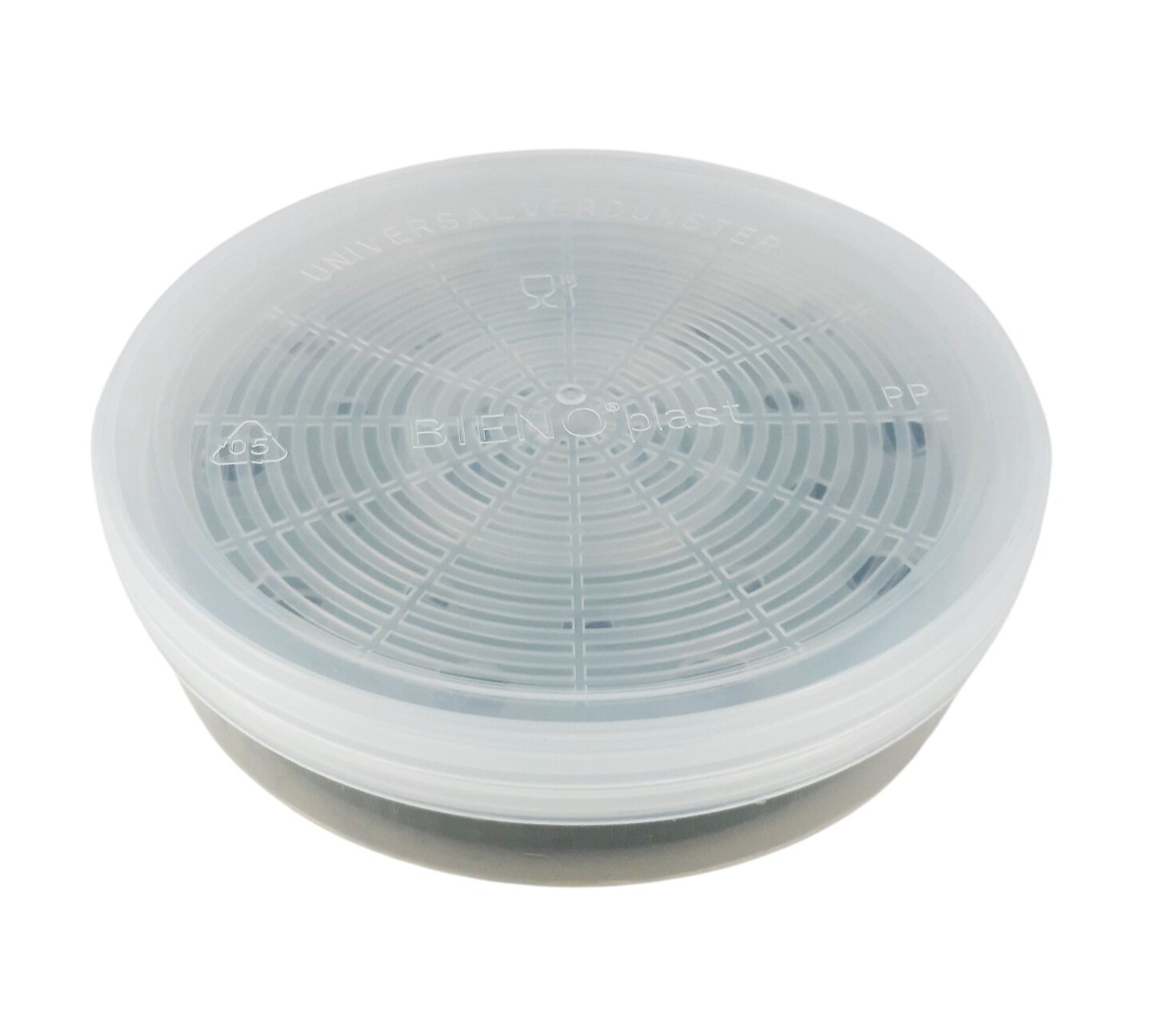 Universal Verdunster; mit zwei gegenläufigen Lochscheiben, Speicherblock, Abstandring und Deckel. Ø: ca. 16,8 cm; Höhe: ca. 4,5 cm. Der Universal Verdunster wird für die Verdunstung von Ameisensäure im Bienenvolk für die Bekämpfung der Varroamilbe eingesetzt. Der Universal Verdunster besteht aus dem Behälter, dem Speicherblock, zwei drehbar gelagerten Lochscheiben, eine Gitterabdeckung sowie einem Deckel. Funktion: Die Ameisensäure wird in die Mitte des Universal Verdunsters eingefüllt, welche vom Speicherblock aufgenommen wird. Durch verdrehen der Lochscheiben können die Verdampfungsflächen (Löcher) vergrößert, verkleinert (je nach Außentemperatur und Volkstärke usw.) oder völlig verschlossen werden. Mit der Gitterabdeckung wird der Verdunster dann ins Bienenvolk auf die oberen Rähmchen des Brutraumes (bei abgenommenen Honigräumen!) gestellt. Hinweis: Der Umgang mit Ameisensäure erfordert große Vorsicht. In jedem Fall Schutzbrille, säurefeste Handschuhe und langärmlige Bekleidung tragen!